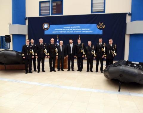 Τελετή παράδοσης δύο καινούριων φουσκωτών σκαφών τύπου “ZODIAC MIL-PRO FC470 ROLL-UP” στο Λιμενικό Σώμα – Ελληνική Ακτοφυλακή από την εταιρεία “Harbor Shipping and Trading S.A.”, πραγματοποιήθηκε σήμερα στον αίθριο χώρο του Υπουργείου Ναυτιλίας και Νησιωτικής Πολιτικής, σε αναγνώριση του ανθρωπιστικού έργου που προσφέρει το Σώμα ως προς την αντιμετώπιση της προσφυγικής κρίσης. Στην τελετή παρέστησαν ο Γενικός Γραμματέας του Υπουργείου κ. Διονύσιος Τεμπονέρας, ως εκπρόσωπος του Υπουργού Ναυτιλίας και Νησιωτικής Πολιτικής, ο Πρόεδρος και Διευθύνων Σύμβουλος της εταιρείας “Harbor Shipping and Trading S.A.” κ. Λουκάς Κτιστάκης, ο Αρχηγός του Λιμενικού Σώματος – Ελληνικής Ακτοφυλακής Αντιναύαρχος Λ.Σ. Σταμάτης Ράπτης, οι δύο Υπαρχηγοί του Σώματος, Αντιναύαρχοι Λ.Σ. Θεόδωρος Κλιάρης και Αθανάσιος Ντούνης, ανώτατοι και ανώτεροι Αξιωματικοί του Λ.Σ.-ΕΛ.ΑΚΤ. καθώς και στελέχη της εταιρείας “Harbor Shipping and Trading S.A.”.