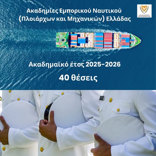 Το Υφυπουργείο Ναυτιλίας ανακοίνωσε πως η Ελληνική Κυβέρνηση θα παραχωρήσει μέχρι 40 θέσεις για φοίτηση Κυπρίων (άρρενες και θήλυς) στις Ακαδημίες Εμπορικού Ναυτικού (Πλοιάρχων και Μηχανικών) Ελλάδας.
