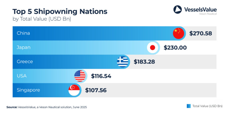 Στην κατάταξη των ισχυρότερων ναυτιλιακών κρατών, η Κίνα διατηρεί την πρώτη θέση παγκοσμίως με στόλο αξίας 271 δισ. δολαρίων, επιβεβαιώνοντας τον αυξανόμενο ρόλο της στο διεθνές εμπόριο και τη ναυπηγική βιομηχανία. Στη δεύτερη θέση η Ιαπωνία, με στόλο 230 δισ. δολαρίων, διατηρώντας τη μακρά παράδοση δυναμικής παρουσίας στη ναυτιλία. Την τρίτη θέση καταλαμβάνει η Ελλάδα, με στόλο αξίας 183 δισ. δολαρίων, εδραιώνοντας για ακόμη μια χρονιά την ηγεμονία της στην ποντοπόρο ναυτιλία δεξαμενόπλοιων και φορτηγών- bulk carriers.