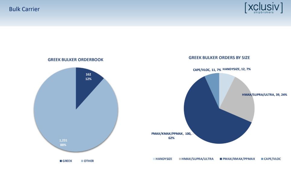 Στον τομέα των ξηρών φορτίων, οι Έλληνες εφοπλιστές έχουν υπό ναυπήγηση 162 bulk carriers, αντιστοιχώντας περίπου στο 12% του παγκόσμιου orderbook. Η μεγαλύτερη κινητικότητα εντοπίζεται σε πλοία PMAX, KMAX και PPMAX, που συγκεντρώνουν το 62% των ελληνικών παραγγελιών. Παράλληλα, υπάρχει σημαντικό ενδιαφέρον και για τα HMAX, Supra και Ultra, υπογραμμίζοντας τη στρατηγική ανανέωσης στόλων μεσαίου και μεγάλου μεγέθους.