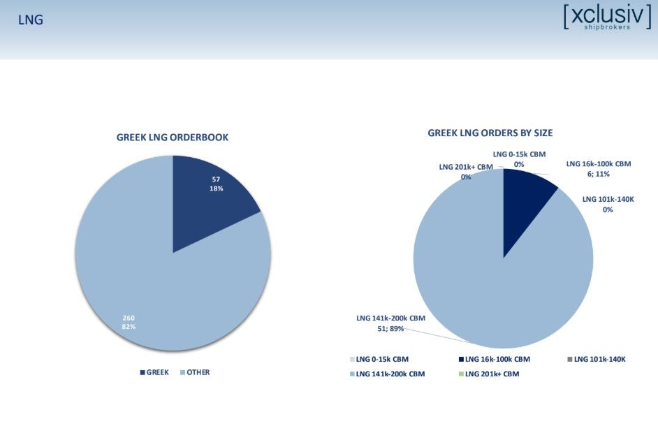 Η αγορά LNG παρουσιάζει αυξημένη δραστηριότητα, με 57 LNG carriers υπό ναυπήγηση στην Ελλάδα, ποσοστό 18% του παγκόσμιου orderbook. Οι περισσότερες παραγγελίες αφορούν πλοία χωρητικότητας 141k–200k CBM, την κορυφαία κατηγορία διεθνώς. Το παγκόσμιο orderbook LNG βρίσκεται στο 39%, υποδηλώνοντας μία νέα εποχή ανάπτυξης για τη μεταφορά φυσικού αερίου.