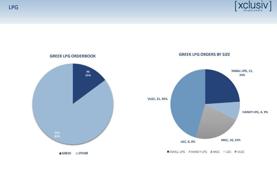 Στον κλάδο LPG, οι Έλληνες έχουν 46 παραγγελίες, ποσοστό 15% του παγκόσμιου συνόλου, κυρίως για VLGC και MGC, δείχνοντας προτίμηση σε πλοία μεγαλύτερης χωρητικότητας και αποδοτικότητας. Το παγκόσμιο orderbook LPG αγγίζει το 37,1%, ενώ πάνω από το ένα τέταρτο του στόλου είναι άνω των 21 ετών, ενισχύοντας την ανάγκη για νεότερα πλοία.