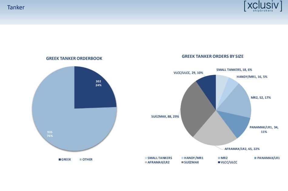 Στον κλάδο των δεξαμενόπλοιων, η Ελλάδα συνεχίζει να πρωταγωνιστεί, με 302 tankers υπό ναυπήγηση, ποσοστό που αντιστοιχεί στο 24% του παγκόσμιου orderbook. Οι παραγγελίες εστιάζουν σε μεγέθη όπως Suezmax, Aframax/LR2 και VLCC, επιβεβαιώνοντας τη στρατηγική επένδυση σε σύγχρονα και ενεργειακά αποδοτικά πλοία που θα διασφαλίσουν τη μεταφορά υγρών φορτίων τα επόμενα χρόνια. Το παγκόσμιο orderbook των tankers αγγίζει το 16,7%, με μέση ηλικία στόλου 13,7 ετών.