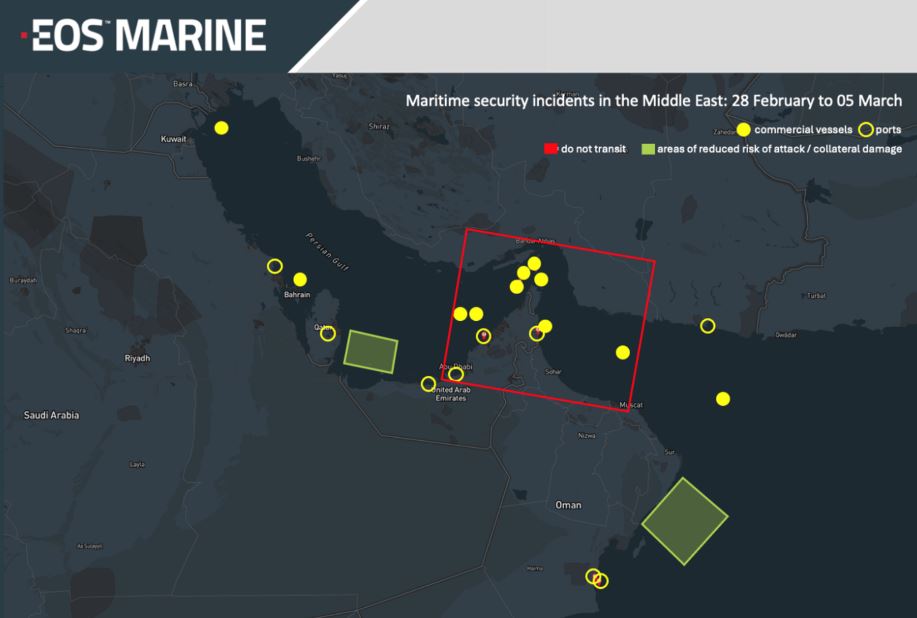 Σύμφωνα με τον ίδιο, το επίπεδο απειλής για τη ναυσιπλοΐα στα Στενά του Ορμούζ έχει ανέλθει στο υψηλότερο επίπεδο κινδύνου, με τις επιθέσεις ή τα περιστατικά εναντίον εμπορικών πλοίων στον Περσικό Κόλπο, στον Κόλπο του Ομάν και στην ευρύτερη περιοχή να έχουν φτάσει τουλάχιστον τα 13 από τα τέλη Φεβρουαρίου.