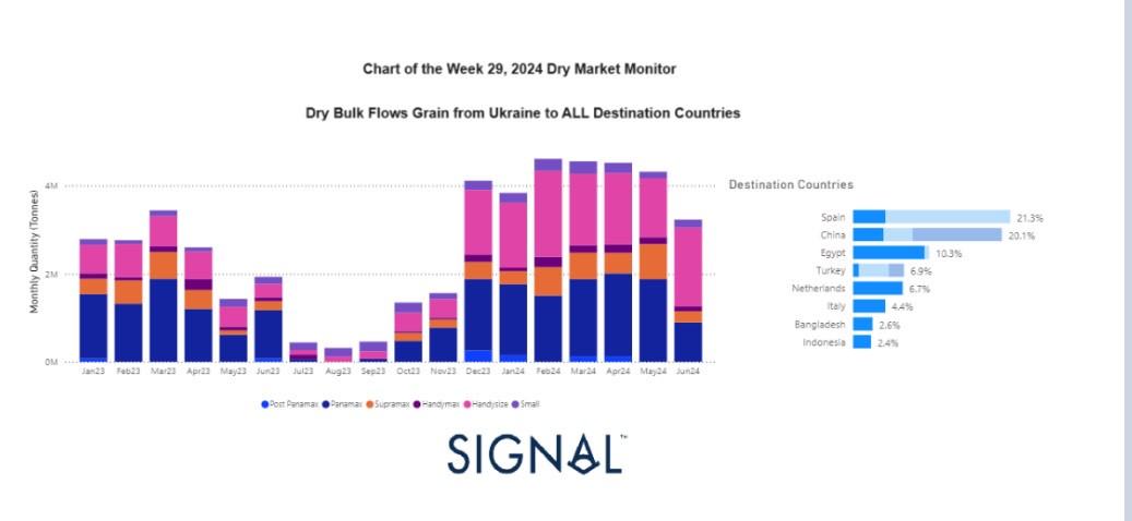 Σύμφωνα με την Μαρία Μπερτζελέτου αναλύτρια της SIGNAL «τα στοιχεία αποκαλύπτουν ότι η Ισπανία και η Κίνα έχουν γίνει οι κορυφαίοι προορισμοί για τα ουκρανικά σιτηρά, αντιπροσωπεύοντας η καθεμία το 20% των συνολικών εξαγωγών, ακολουθούμενες από την Αίγυπτο με μερίδιο 10% (δεξί διάγραμμα). Αυτή η διαφοροποίηση των εξαγωγικών προορισμών αναδεικνύει τις προσπάθειες της Ουκρανίας να διατηρήσει τις εμπορικές ροές των γεωργικών προϊόντων της εν μέσω γεωπολιτικών διαταραχών.