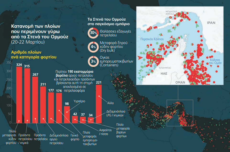 Παράλληλα, εκτιμάται ότι έως και 540 δεξαμενόπλοια παραμένουν εγκλωβισμένα λόγω της κρίσης, ενώ περίπου το 5% του παγκόσμιου στόλου δεξαμενόπλοιων (VLCC) βρίσκεται ακινητοποιημένο στην περιοχή. Η μείωση των διελεύσεων αγγίζει το 95%.