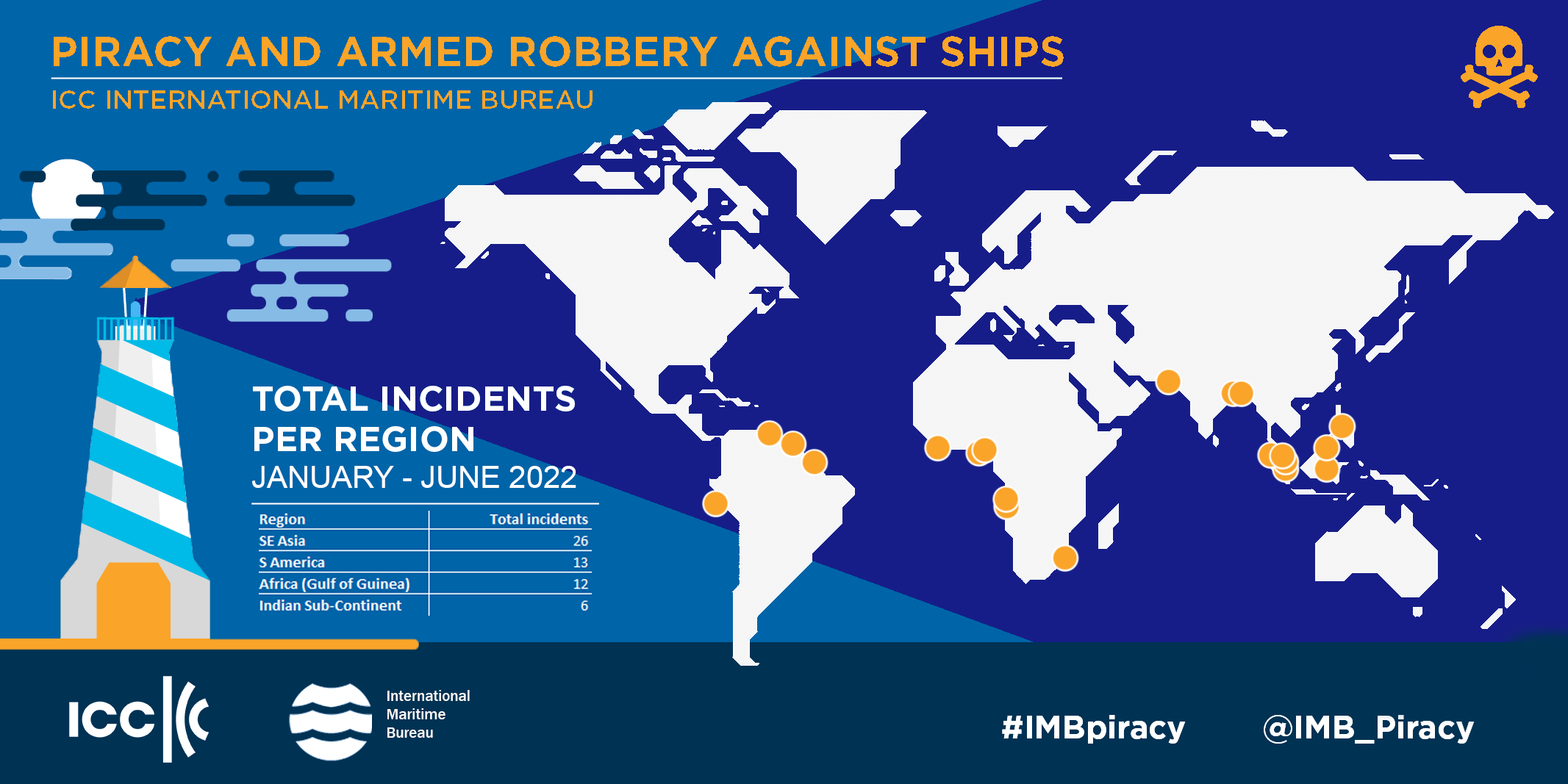 Κατά τους πρώτους έξι μήνες του 2022, το Κέντρο Αναφοράς Πειρατείας (PRC) του ΙΜΒ ανέφερε 55 επιβιβάσεις –ρεσάλτο σε πλοία, δύο απόπειρες επιθέσεων και ένα πλοίο που πήραν τον έλεγχό του οι πειρατές .