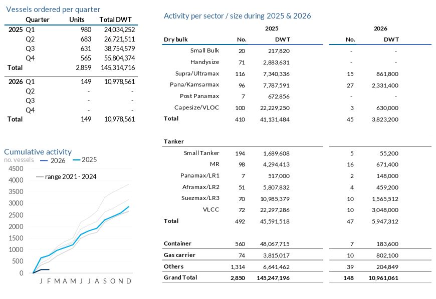 Σε επίπεδο συνολικής δραστηριότητας ναυπηγήσεων, τα στοιχεία δείχνουν ότι το 2025 καταγράφηκαν παραγγελίες για 2.859 πλοία συνολικής χωρητικότητας 145,3 εκατ. dwt, με το τέταρτο τρίμηνο να εμφανίζει τη μεγαλύτερη δραστηριότητα (565 πλοία – 55,8 εκατ. dwt). Για το 2026, έως τις αρχές Φεβρουαρίου, έχουν καταγραφεί 149 παραγγελίες συνολικής χωρητικότητας περίπου 11 εκατ. dwt.