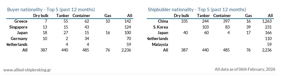 Σε επίπεδο ναυπηγείων, η Κίνα διατηρεί σαφές προβάδισμα, συγκεντρώνοντας 1.263 παραγγελίες πλοίων σε όλες τις κατηγορίες το τελευταίο 12μηνο. Ακολουθεί η Νότια Κορέα με 231 πλοία και η Ιαπωνία με 166, ενώ μικρότερα αλλά αξιοσημείωτα μερίδια κατέχουν η Ολλανδία και η Μαλαισία.