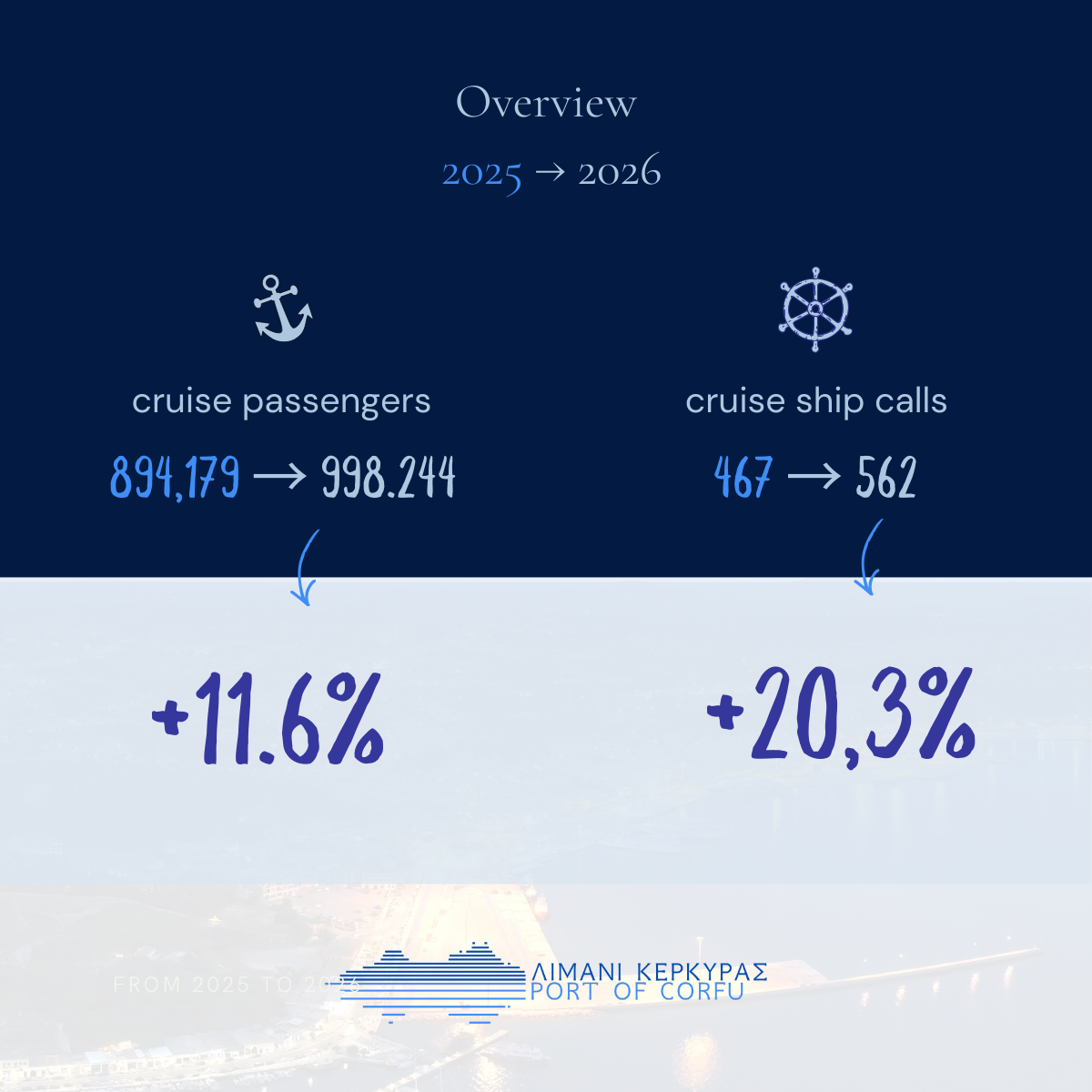 Για το 2026 έχουν προγραμματιστεί συνολικά 562 προσεγγίσεις κρουαζιερόπλοιων, αριθμός αυξημένος κατά 20,3% σε σχέση με τον προηγούμενο χρόνο. Παράλληλα, αναμένεται η άφιξη 998.244 επιβατών, με τα διαθέσιμα στοιχεία να καταδεικνύουν θετική τάση υπέρβασης του ορίου αυτού, καθώς η ζήτηση για την Κέρκυρα ενισχύεται τόσο κατά την υψηλή περίοδο όσο και στη λεγόμενη «ώριμη» και εκτός αιχμής σεζόν.
