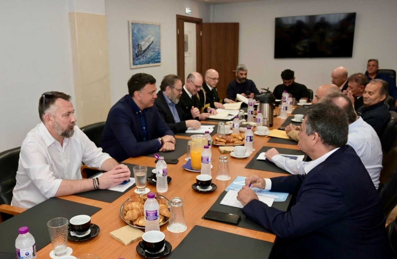 Σε πολύ καλό κλίμα πραγματοποιήθηκε σήμερα στην Πανελλήνια Ναυτική Ομοσπονδία (ΠΝΟ) συνάντηση εργασίας του υπουργού Ναυτιλίας και Νησιωτικής Πολιτικής, Βασίλη Κικίλια, παρουσία του Γενικού Γραμματέα Ναυτιλίας και Λιμένων, Ευάγγελου Κυριαζόπουλου και του Α’ Υπαρχηγού ΛΣ-ΕΛΑΚΤ, Αντιναυάρχου Λ.Σ. Χρήστου Κοντορουχά, με τον Γενικό Γραμματέα της ΠΝΟ Capt. Εμμανουήλ Τσικαλάκη και τους Προέδρους των ναυτικών σωματείων της ΠΝΟ, οι οποίοι παρουσίασαν αναλυτικά τα θέματα που απασχολούν τον κλάδο.