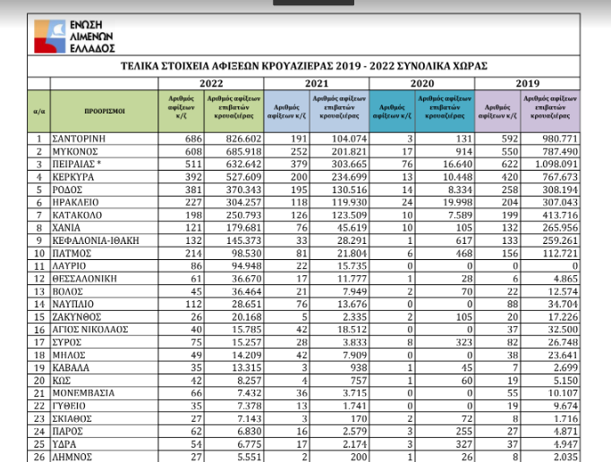 Στον αριθμό κρουαζιερόπλοιων στις πρώτες θέσεις βρίσκονται η Σαντορίνη, η Μύκονος, ο Πειραιάς, η Κέρκυρα, η Ρόδος, το Ηράκλειο, η Πάτμος και το Κατάκολο.