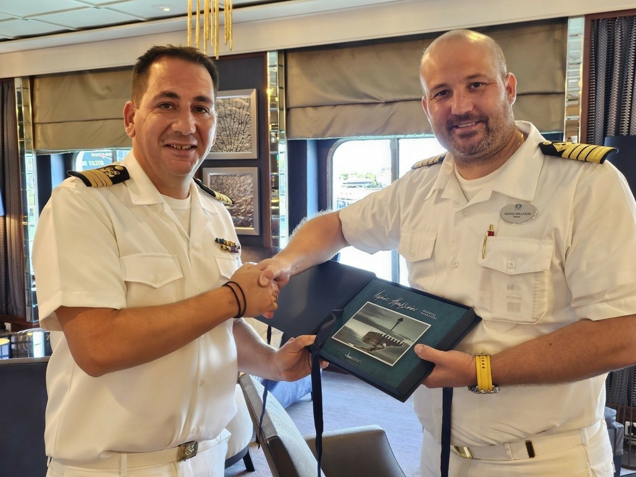Ο Διευθύνων Σύμβουλος του ΟΛΗ Μηνάς Παπαδάκης στο πλαίσιο της εθιμοτυπικής επίσκεψης, μετέβη στο κρουαζιερόπλοιο συνοδευόμενος από την Υπεύθυνη του Τομέα Κρουαζιέρας κ. Κυριακή Καμπανά και από τον Υπολιμενάρχη του Κεντρικού Λιμεναρχείου Ηρακλείου κ. Νικόλαο Τσομπάνη όπου τους υποδέχτηκε ο καπετάνιος Willheim Nenada.