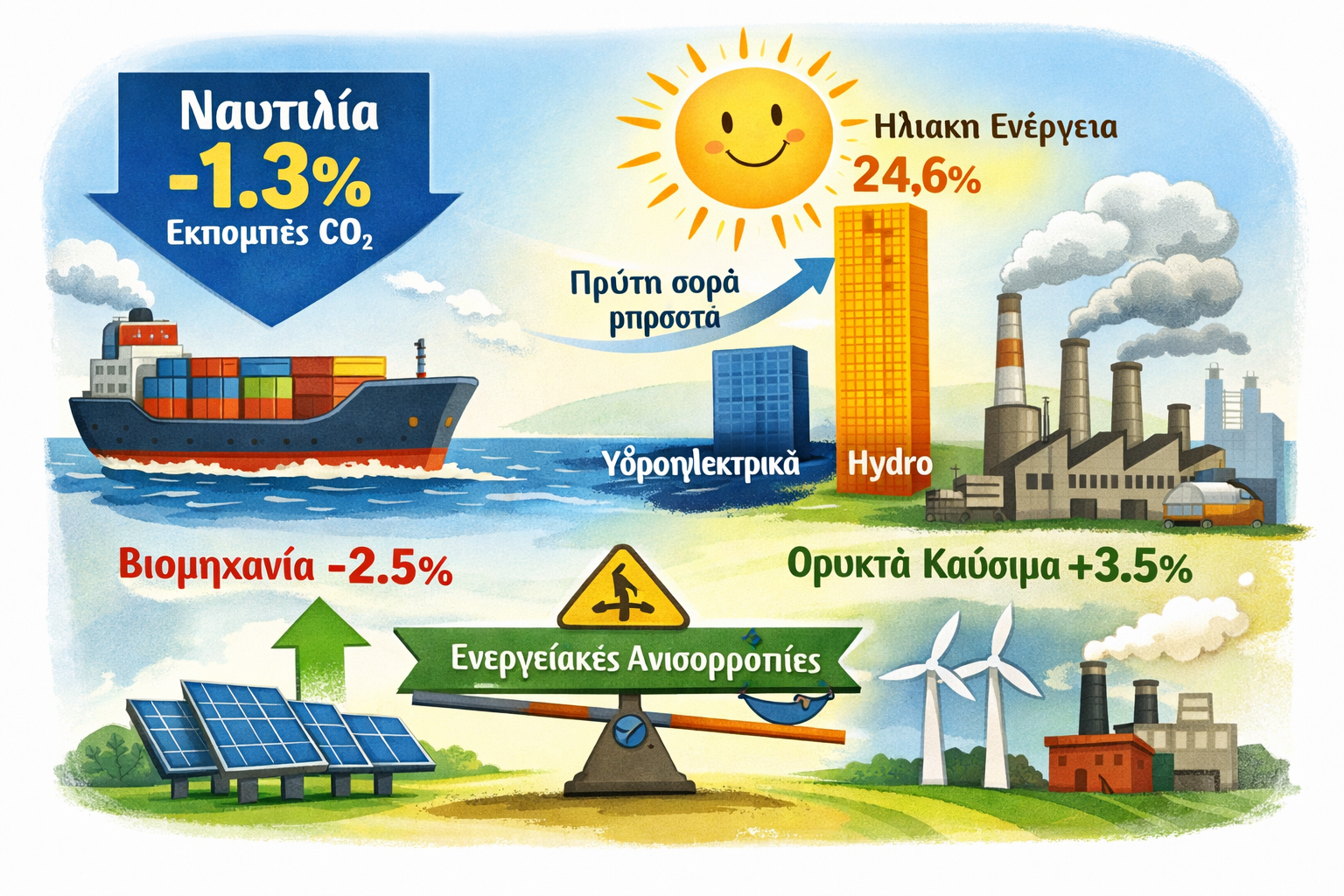 Στον τομέα της ναυτιλίας, τα πρώτα διαθέσιμα δεδομένα δείχνουν μείωση εκπομπών περίπου 3% για το 2025. Τα στοιχεία αυτά βασίζονται στις αναφορές που υπέβαλαν τα κράτη-μέλη έως την προθεσμία της 31ης Μαρτίου 2026, στο πλαίσιο των εγκαταστάσεων, της αεροπορίας και των θαλάσσιων μεταφορών.