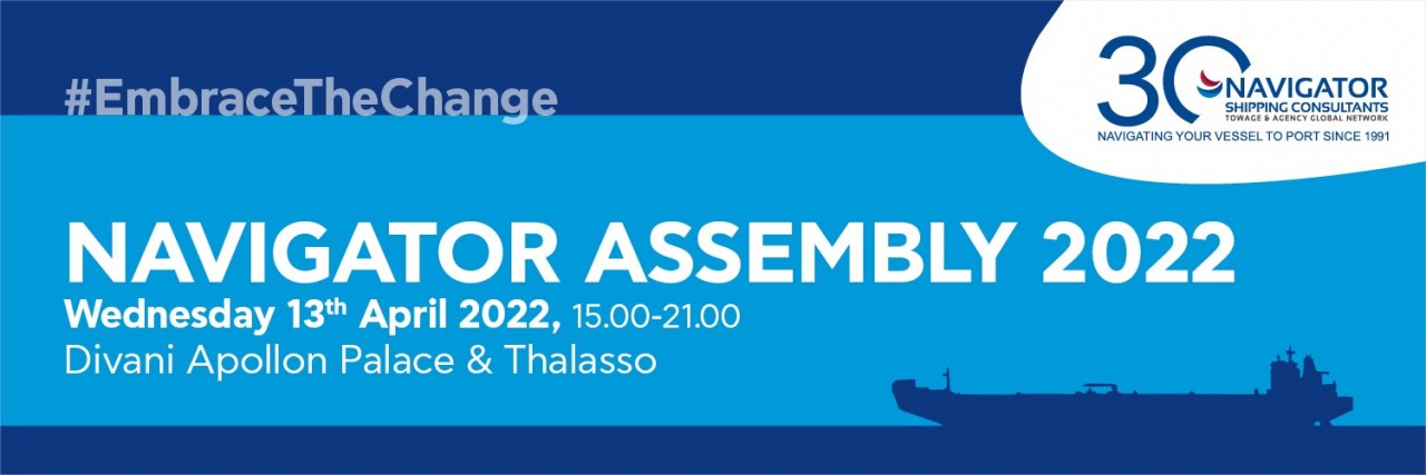 Η NAVIGATOR SHIPPING CONSULTANTS με χαρά ανακοινώνει τη διοργάνωση του NAVIGATOR ASSEMBLY 2022 το οποίο θα λάβει χώρα δια ζώσης την Τετάρτη 13 Απριλίου 2022 στο DIVANI APOLLON PALACE & THALASSO, 15.00-21.00 υπό τον τίτλο «#EmbraceTheChange»-Αγκάλιασε την Αλλαγή.