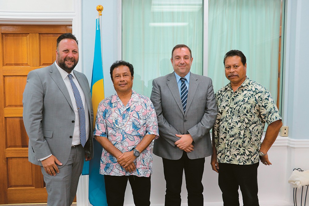 Ο δ/νων σύμβουλος του Νηολογίου του Παλάου, Πάνος Κιρνίδης, ο πρόεδρος Τόμι Ε. Ρεμενγκεσάου ο νεότερος, ο Μηνάς Τσαμόπουλος και ο Στιβ Κανάι, μόνιμος εκπρόσωπος του Παλάου στον ΙΜΟ – Διεθνή Οργανισμό Ναυτιλίας