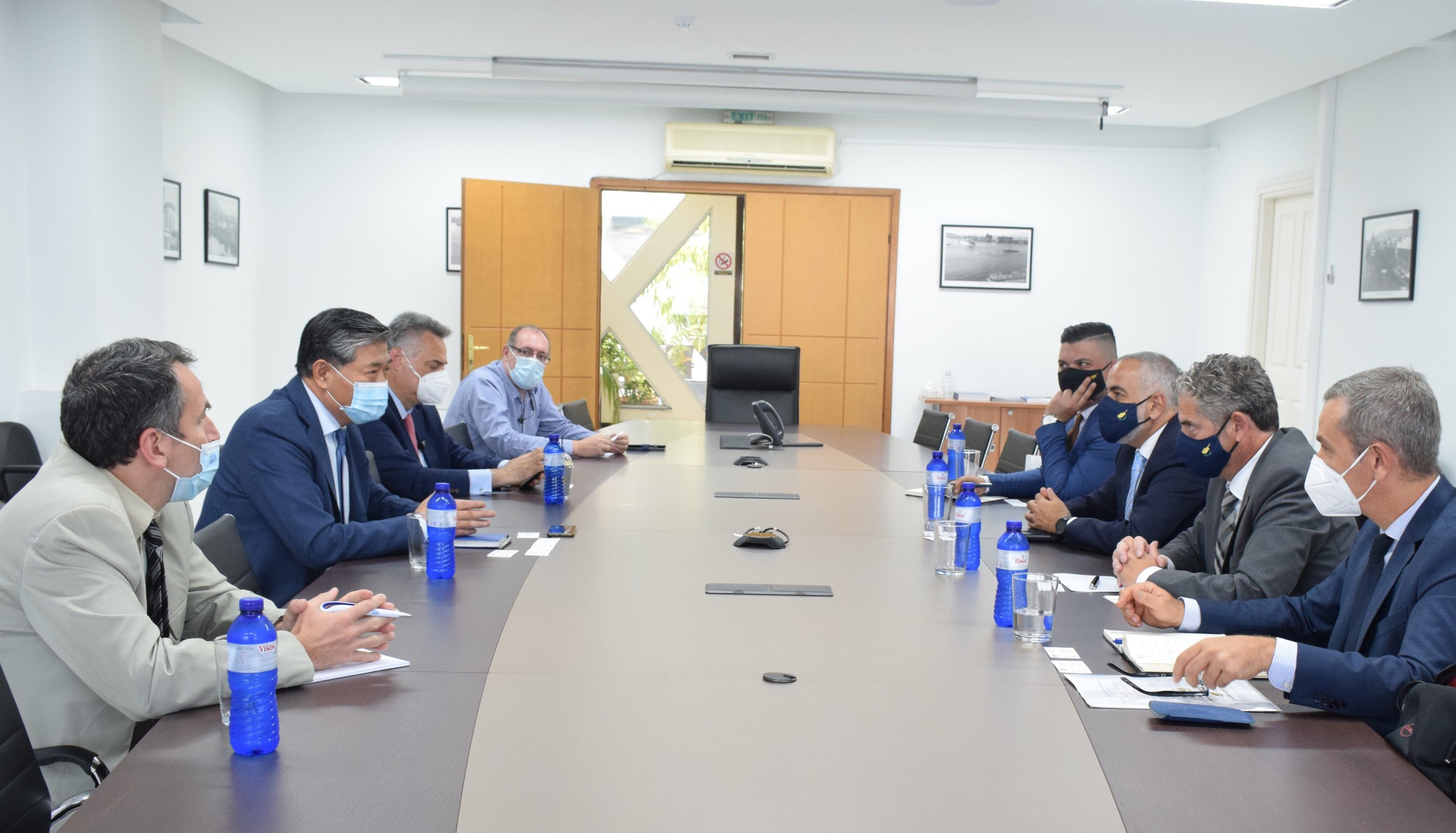 Ο Captain Weng Lin και ο κ. Άγγελος Καρακώστας, Αναπληρωτές Διευθύνοντες Σύμβουλοι της ΟΛΠ Α.Ε. συναντήθηκαν σήμερα, στα κεντρικά γραφεία του Οργανισμού στον Πειραιά, με τον Υφυπουργό Ναυτιλίας της Κύπρου κ. Βασίλη Δημητριάδη και τον Γενικό Διευθυντή του Κυπριακού Υφυπουργείου Ναυτιλίας κ. Νεόφυτο Παπαδόπουλο, με θέμα τη θαλάσσια σύνδεση Κύπρου – Ελλάδας και συγκεκριμένα την ακτοπλοϊκή διασύνδεση του Πειραιά με τη Λεμεσό.