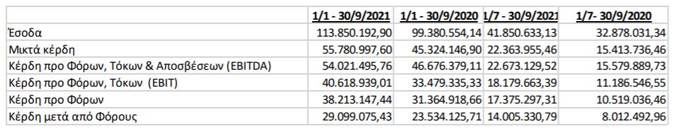 Τα κέρδη προ φόρων, τόκων, αποσβέσεων και επενδυτικών αποτελεσμάτων (EBITDA) της εταιρίας, που ανήλθαν σε Ευρώ 54.021 χιλ. στην περίοδο 01.01.2021‐30.09.2021 και σε Ευρώ 22.673 χιλ. κατά το Γ΄ τρίμηνο, έναντι Ευρώ 46.676 χιλ. και Ευρώ 15.580 χιλ. στις αντίστοιχες περιόδους της προηγούμενης χρήσης 2020, παρουσιάζοντας αύξηση κατά 15,74% και 45,53% αντίστοιχα.