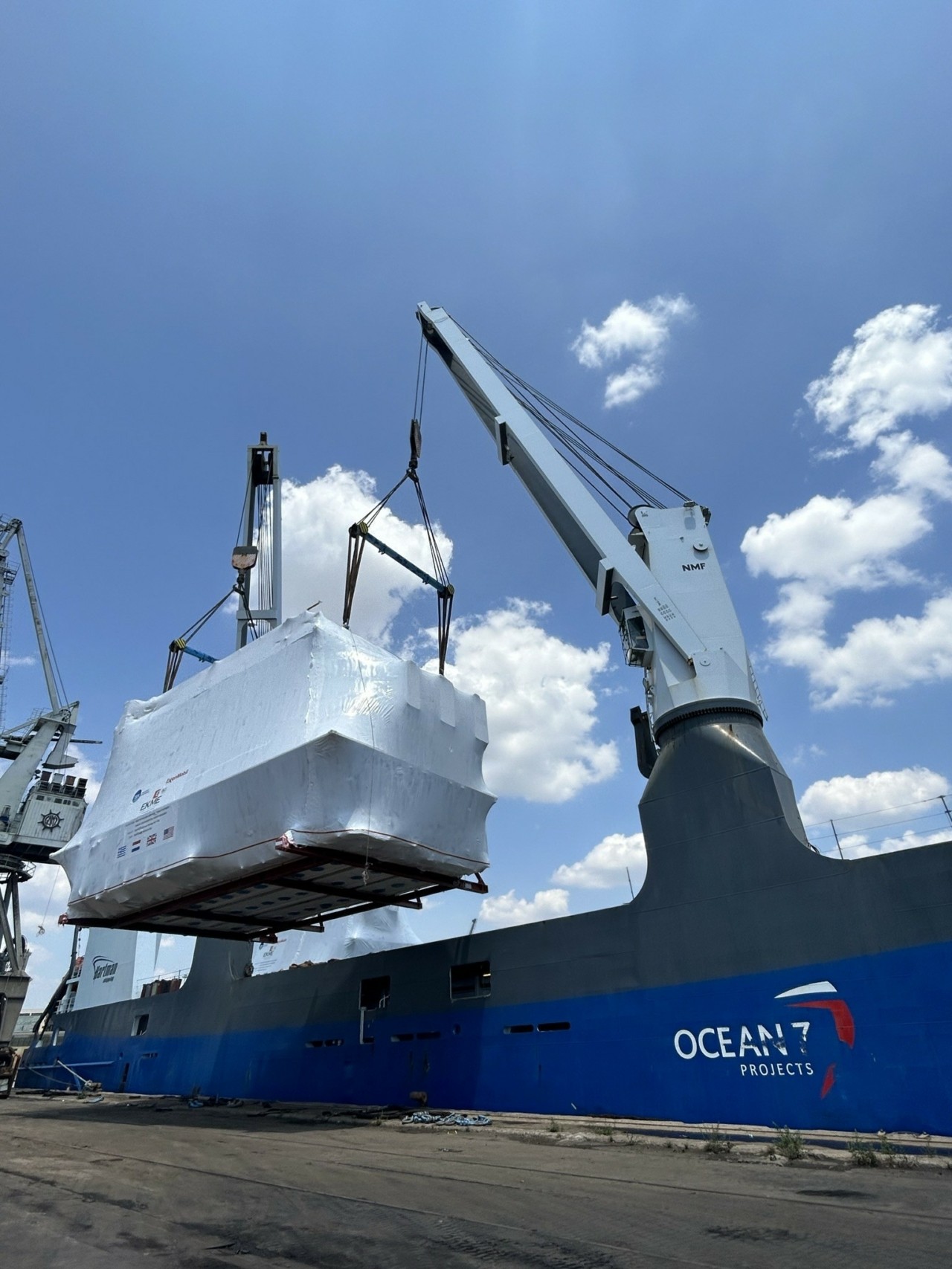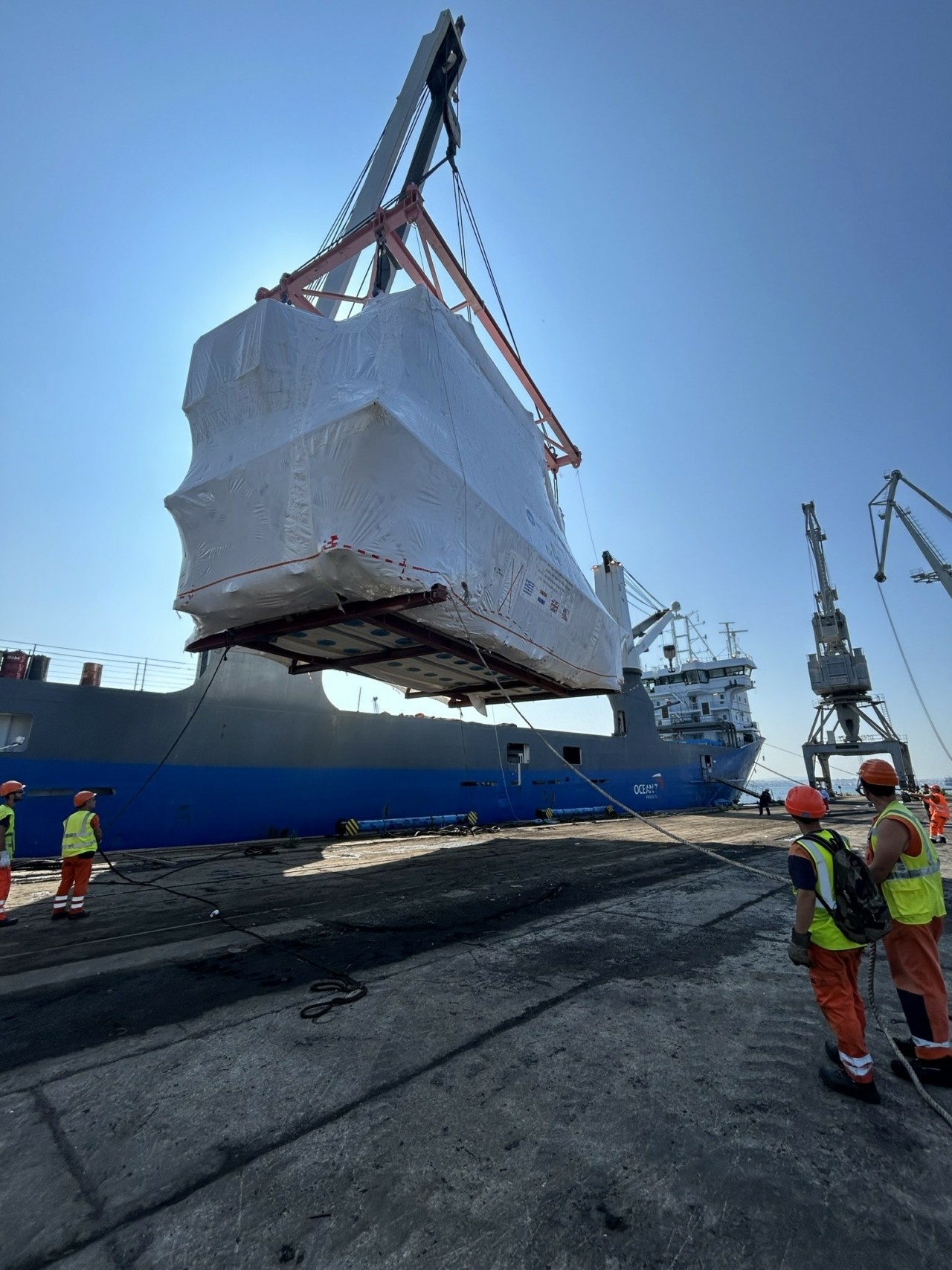 Τον περασμένο Ιούλιο, ολοκληρώθηκε η μεταφορά του εξοπλισμού από το εργοστάσιο της ΕΚΜΕ που εδρεύει στα Διαβατά Θεσσαλονίκης, με παράδοση στο λιμάνι της Θεσσαλονίκης και φόρτωση στο πλοίο βαρέων μεταφορών της Ocean7, MV Atlantic Dawn με ολική χωρητικότητα τους 5.460 κόρους.