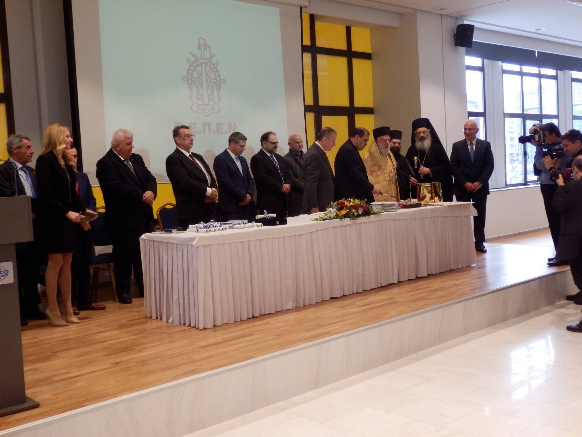 Σεβασμιότατε Μητροπολίτη Σύρου, Σεβασμιότατε Μητροπολίτη Πειραιά, Άγιοι Πατέρες, Κύριε Υφυπουργέ Εμπορικής Ναυτιλίας, Κυρία Υφυπουργέ Εργασίας, Κύριοι Βουλευτές, Κύριε Δήμαρχε Πειραιά, Κύριοι Γενικοί Γραμματείς του Υ.Ν.Α, Κύριοι πρώην Γενικοί Γραμματείς του Υ.Ν.Α, Κύριε Αρχηγέ του ΛΣ, Κύριε πρώην Αρχηγέ ΛΣ, Κύριοι Υπαρχηγοί και Κ.Κ Αξιωματικοί του Λιμενικού Σώματος, Κύριε Πρόεδρε του Ελληνικού Ερυθρού Σταυρού, Κυρία Εκπρόσωπε της Ύπατης Αρμοστείας του Ο.Η.Ε., Κυρία Πρόεδρε της Ένωσης Ελλήνων Εφοπλιστών, Κύριε Πρόεδρε του ΣΕΕΝ, Κύριοι Πρόεδροι και Μέλη των άλλων Εφοπλιστικών Ενώσεων, Κύριε Πρόεδρε και Κύριε Γενικέ Γραμματέα της Γ.Σ.Ε.Ε., Κύριε Διοικητή του Ν.Α.Τ., Κύριε Πρώην Πρόεδρε του Ν.Α.Τ., Κύριε Πρόεδρε του Ν.Ε.Ε., Κύριοι Συνάδελφοι των άλλων Σωματείων, Κύριοι Πρόεδροι Φορέων και Οργανισμών, Κυρίες και Κύριοι, Εκλεκτοί Προσκεκλημένοι μας, Αγαπητοί Συνάδελφοι…