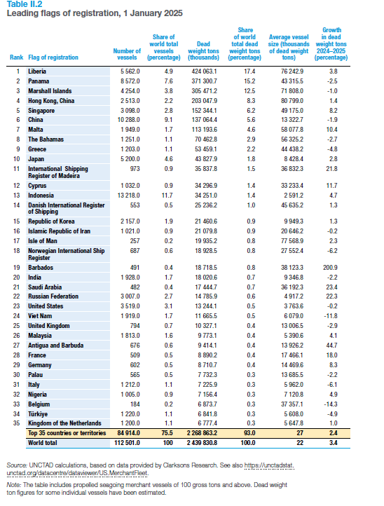Ως την 1η Ιανουαρίου 2025, η Λιβερία διατήρησε την πρώτη θέση παγκοσμίως μεταξύ των νηολογίων, ακολουθούμενη από τον Παναμά και τα Νησιά Μάρσαλ. Οι τρεις αυτές χώρες συγκεντρώνουν το 46,5% της παγκόσμιας χωρητικότητας σε deadweight tons, το 16,2% του αριθμού των πλοίων και το 36,1% της αξίας του παγκόσμιου στόλου.
