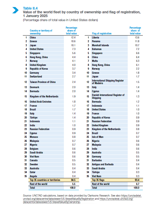 Η Κίνα, συμπεριλαμβανομένου του Χονγκ Κονγκ, θα καταλάμβανε την πρώτη θέση παγκοσμίως με 20,2% αν υπολογιστεί ως ενιαία δύναμη. Παράλληλα, η αξία του κινεζικού στόλου φθάνει το 12,4% της παγκόσμιας αξίας, καταδεικνύοντας την αυξανόμενη παρουσία της Ασίας στη διεθνή ναυτιλία.