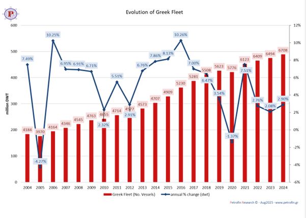 Ο ελληνόκτητος στόλος συνέχισε την ανοδική του πορεία το 2024, με συνολική αύξηση 214 πλοίων και 13,8 εκατ. DWT, ήτοι +2,9% σε σχέση με το προηγούμενο έτος, σύμφωνα με την έρευνα της Petrofin SA. Η αύξηση αφορά κυρίως πλοία άνω των 20.000 DWT, τα οποία ανήλθαν σε 174 μονάδες, αντιπροσωπεύοντας 13,5 εκατ. dwt και διαχειρίζονται 402 εταιρείες, εννέα λιγότερες σε σχέση με το 2023.