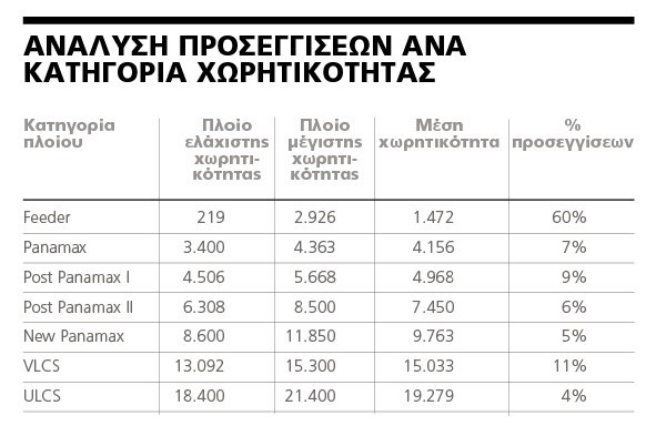 Το 60% των προσεγγίσεων αφορούν πλοία feeder, με χωρητικότητα μικρότερη των 3.000 TEUs. Στον αντίποδα, το 15% των προσεγγίσεων αφορά πλοία χωρητικότητας άνω των 12.500 TEUs (VLCS και ULCS) με τα πλοία άνω των 18.000 TEUs να αποτελούν το 4% των συνολικών προσεγγίσεων.
