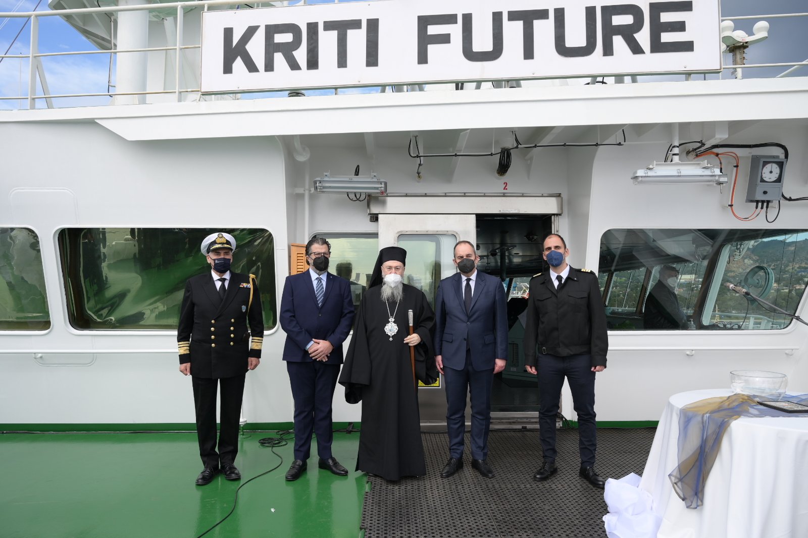 Την Ελληνική σημαία ύψωσε σήμερα στο νεότευκτο δεξαμενόπλοιο «KRITI FUTURE», του ομίλου AVIN ο Υπουργός Ναυτιλίας και Νησιωτικής Πολιτικής κ. Γιάννης Πλακιωτάκης, στην διάρκεια του αγιασμού το πλοίου που πραγματοποιήθηκε στους Αγίους Θεοδώρους, παρουσία του Σεβασμιότατου Μητροπολίτη Κορίνθου, Σικυώνος, Ζεμενού, Ταρσού και Πολυφέγγους κ.κ. Διονύσιου και στελεχών της διαχειρίστριας εταιρίας.