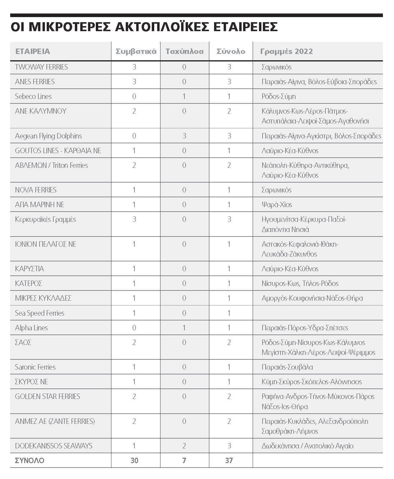 Σε αυτή την κατηγορία εντάξαμε 22 εταιρείες που δραστηριοποιούνται στον χώρο κυρίως σε άγονες και ενδονησιωτικές γραμμές. Η αναφορά, σύμφωνα με την έρευνα, γίνεται πάντα σε επίπεδο στόλου και μόνο καθώς αυτές οι εταιρείες δεν δημοσιοποιούν οικονομικά ή άλλου είδους στοιχεία. Τα στοιχεία των στόλων προέρχονται από τις ιστοσελίδες των εταιρειών, ενώ τα στοιχεία για τις αγοραπωλησίες των πλοίων προέρχονται από το Διαδίκτυο και από πηγές της αγοράς.