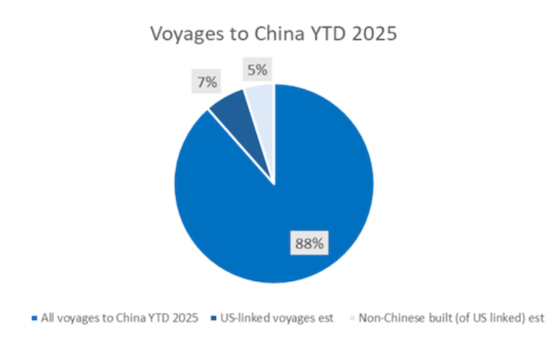 Σύμφωνα με δεδομένα της Signal Ocean για το 2025, τα πλοία με σύνδεση στις ΗΠΑ αντιπροσωπεύουν περίπου το 7% όλων των πλοίων μεταφοράς πετρελαίου προς Κίνα, ενώ μόνο το 5% αυτών αφορά πλοία μη κινεζικής κατασκευής. «Το ποσοστό αυτό δείχνει ότι οι απευθείας επιπτώσεις στη ροή πετρελαίου είναι σχετικά περιορισμένες», σημειώνει η Μπερτζελέτου.