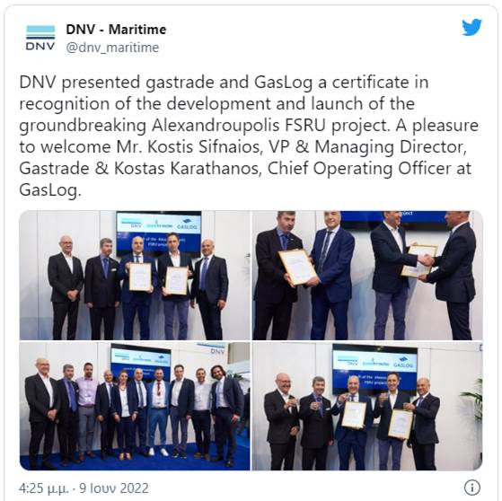 Χθες σε μια ειδική εκδήλωση στο πλαίσιο των Ποσειδωνίων 2022, η Gastrade και η Gaslog βραβεύθηκαν από την DNV, τον κορυφαίο ανεξάρτητο νηογνώμονα στον κόσμο, ως ελάχιστο δείγμα αναγνώρισης στο γεγονός ότι οι εν λόγω επιχειρήσεις ανέπτυξαν και προχωρούν στην υλοποίηση της υπερσύγχρονης Πλωτής Μονάδα Αποθήκευσης και Αεριοποίησης Υγροποιημένου Φυσικού Αερίου (FSRU) της Αλεξανδρούπολης, που αναμένεται να αλλάξει τον ενεργειακό χάρτη όχι μονάχα της χώρας μας αλλά ολόκληρης της νοτιοανατολικής Ευρώπης.