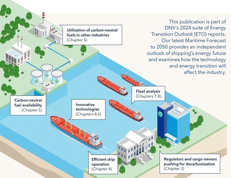 Διερευνά το DNV σενάρια για την επίτευξη της απαλλαγής από τον άνθρακα (βιοκαύσιμα και δέσμευση άνθρακα επί του πλοίου, μεθανόλη, αμμωνία και υδρογόνο), διερευνώντας επίσης τις συνθήκες υπό τις οποίες η απορρόφηση τύπων καυσίμων ή τεχνολογιών θα επιταχυνθεί έως το 2050.