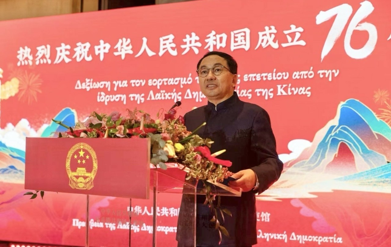 Σε μια λαμπρή τελετή που φιλοξενήθηκε στην Αθήνα με αφορμή τη συμπλήρωση 76 ετών από την ίδρυση της Λαϊκής Δημοκρατίας της Κίνας, ο πρέσβης κ. Fang Qiu μίλησε ενώπιον σχεδόν 500 διακεκριμένων καλεσμένων από το ελληνικό κοινοβούλιο, την κυβέρνηση, πολιτικά κόμματα, τις ένοπλες δυνάμεις, τον επιχειρηματικό και ακαδημαϊκό κόσμο, καθώς και εκπροσώπων του διπλωματικού σώματος και κινεζικών εταιρειών που δραστηριοποιούνται στην Ελλάδα.