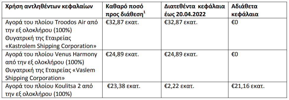 Σύμφωνα με τις δεσμεύσεις που διατυπώνονται στο σχετικό Ενημερωτικό Δελτίο που εγκρίθηκε από την Επιτροπή Κεφαλαιαγοράς και τις από 17.02.2022, 11.04.2022 και 19.04.2022 αποφάσεις του Διοικητικού Συμβουλίου της Εταιρείας, γνωστοποιείται ότι τα αντληθέντα κεφάλαια ποσού ύψους εκατό εκατομμυρίων ευρώ (€100.000.000), μείον ποσό ύψους δυόμισι εκατομμυρίων ευρώ (€2.500.000) περίπου το οποίο αφορά δαπάνες έκδοσης, διατέθηκαν μέχρι την 20.04.2022 ως ακολούθως: