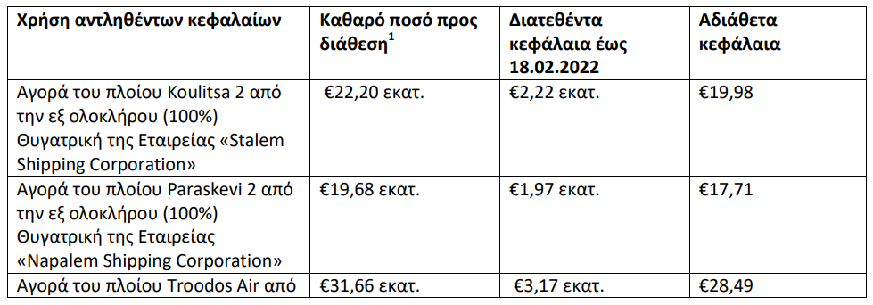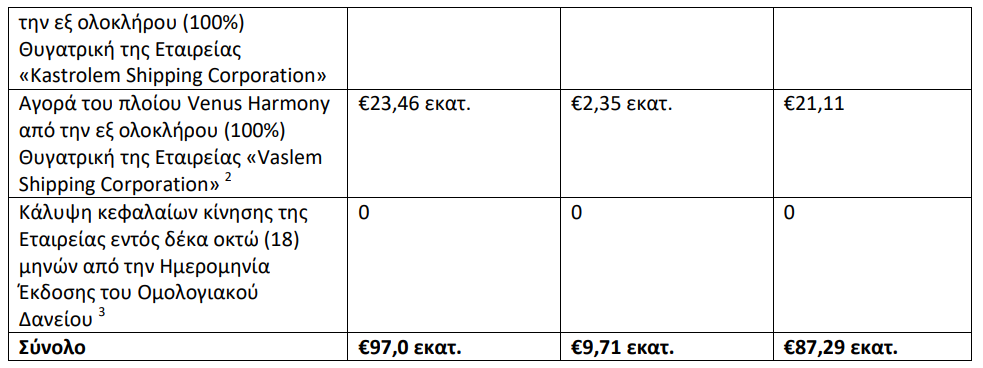 Χάριν πληρότητος σημειώνεται ότι το ποσό των €9,71 εκατ. αντιστοιχεί σε προκαταβολή ύψους 10% του τιμήματος σε δολάρια Η.Π.Α. για την αγορά των πλοίων Koulitsa 2, Paraskevi 2, Troodos Air και Venus Harmony και διατέθηκε βάσει εκάστου συναφθέντος Μνημονίου Συμφωνίας μεταξύ των εξ ολοκλήρου (100%) Θυγατρικών της Εταιρείας «Stalem Shipping Corporation», «Napalem Shipping Corporation», «Kastrolem Shipping Corporation» και «Vaslem Shipping Corporation» ως Αγοραστριών και των εξ ολοκλήρου (100%) Θυγατρικών της Εγγυήτριας «Kyotofriendo Two Shipping Corporation», «Kyotofriendo One Shipping Corporation», «Shikokuexi Shipping Inc.» και «Armonikos Shipping Corporation» ως Πωλητριών σε Ευρώ. Το ως άνω ποσό διατέθηκε μέσω αύξησης του μετοχικού κεφαλαίου των θυγατρικών της Εταιρείας «Stalem Shipping Corporation», «Napalem Shipping Corporation», «Kastrolem Shipping Corporation» και «Vaslem Shipping Corporation» που θα αποκτήσουν τα υπό εξαγορά πλοία.