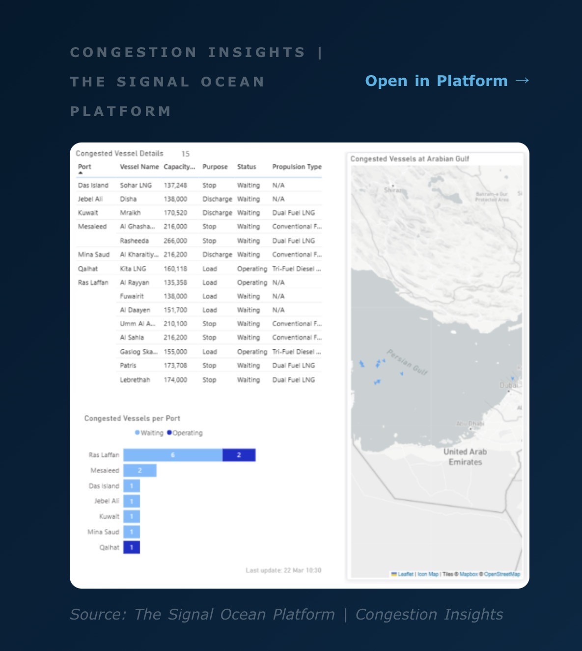 Η κρίση δεν περιορίζεται στην παραγωγή, αλλά επεκτείνεται και στη μεταφορά. Στον Περσικό Κόλπο καταγράφεται αυξημένη παρουσία LNG carriers σε κατάσταση αναμονής, ιδιαίτερα κοντά στο Ras Laffan, ένδειξη συμφόρησης και καθυστερήσεων.