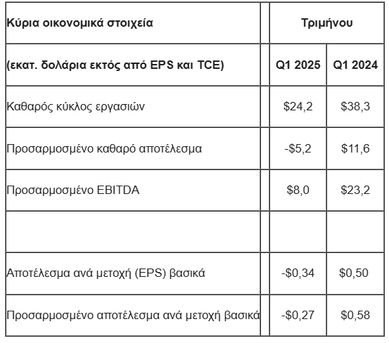 Εν μέσω μιας εποχικά ασθενούς περιόδου για την παγκόσμια ναυτιλία, η Seanergy Maritime Holdings Corp. (NASDAQ: SHIP) ανακοίνωσε σήμερα οικονομικά αποτελέσματα για το πρώτο τρίμηνο του 2025, τα οποία σηματοδοτούν μια μεταβατική φάση για την εταιρεία. Παρά τις καθαρές ζημίες ύψους 5,2 εκατ. δολαρίων και τη μείωση του κύκλου εργασιών στα 24,2 εκατ. δολάρια από 38,3 εκατ. δολάρια το αντίστοιχο τρίμηνο του 2024, η εταιρεία κατέγραψε υπεραπόδοση στον μέσο ημερήσιο ναύλο (TCE), γεγονός που αποτυπώνει τις σωστά στοχευμένες εμπορικές της κινήσεις.