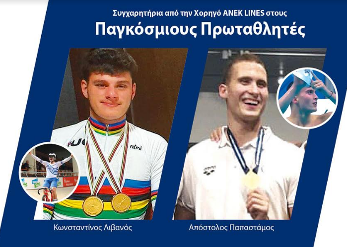 Η ANEK LINES, υπερήφανη χορηγός, συγχαίρει τους Χανιώτες Παγκόσμιους πρωταθλητές Κωσταντίνο Λιβανό του ΤΑΛΩΣ ANEK LINES και Απόστολο Παπαστάμο του Ναυτικού Ομίλου Χανίων (Ν.Ο.Χ) για τις μοναδικές χρυσές διακρίσεις που πρόσφατα κατέκτησαν.