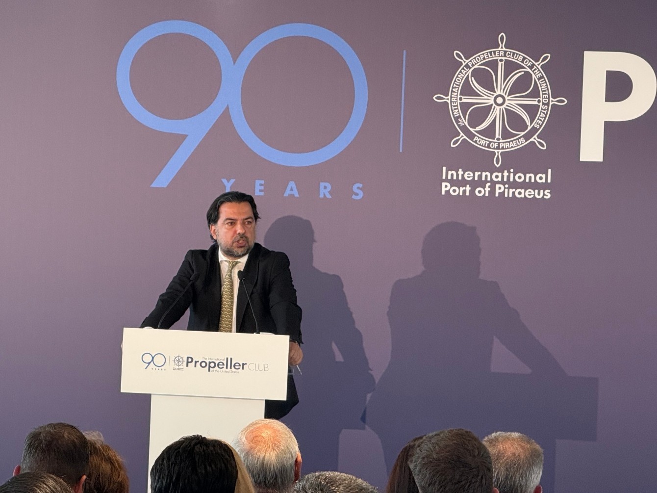 Κεντρική φώτο: Ο υφυπουργός Ναυτιλίας Στέφανος Γκίκας, ο Συμεών Παληός και ο πρόεδρος του Propeller Club Port of Piraeus