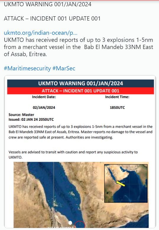 Η βρετανική εταιρεία ναυτικής ασφάλειας Ambrey-global maritime risk management expert ανέφερε χθες Τρίτη 2 Ιανουαρίου 2024 ότι ένα πλοίο μεταφοράς εμπορευματοκιβωτίων με σημαία Μάλτας ειδοποίησε για τρεις εκρήξεις 15 μίλια (24 χλμ.) νοτιοδυτικά της Μότσα της Υεμένης.