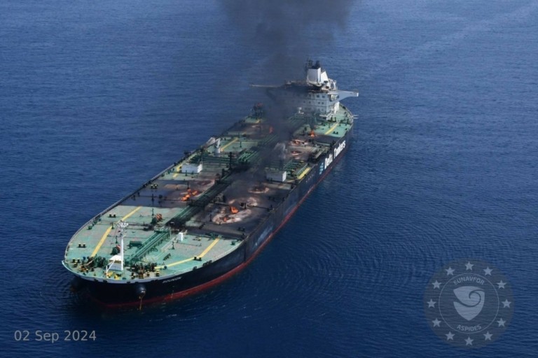 Σύμφωνα με ενημέρωση από την επιχείρηση «Ασπίδες», φρεγάτες συνδράμουν από την 1η Σεπτεμβρίου προσφέροντας προστασία στα ρυμουλκά που πλέουν κοντά στο MV Sounion με στόχο να αποφευχθεί μια πιθανή περιβαλλοντική καταστροφή. Το MV Sounion έχει πιάσει φωτιά και είναι αγκυροβολημένο.