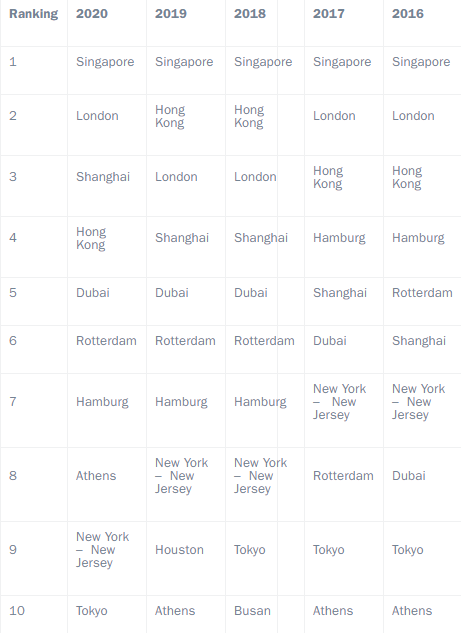 Η Σιγκαπούρη διατήρησε την πρώτη θέση ως διεθνές ναυτιλιακό κέντρο για 7η συνεχόμενη χρονιά. Ο δείκτης για την Ελλάδα αναφέρει την Αθήνα ως το 8ο καλύτερο ναυτιλιακό κέντρο προφανώς σε αντανάκλαση του Πειραιά! Το 2019 βρισκόταν στην 10η θέση.