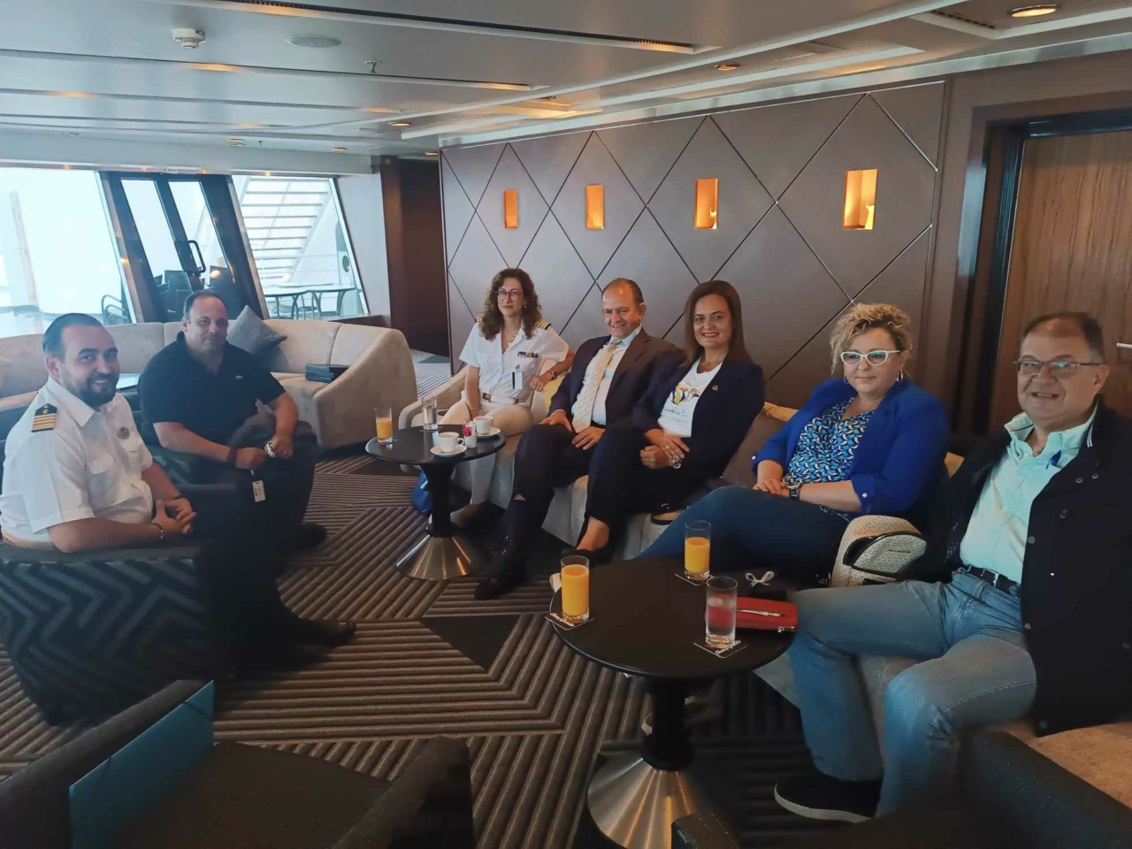 Ο Διευθύνων Σύμβουλος του Οργανισμού Λιμένος Βόλου Σωκράτης Αναγνώστου, μετά από πρόσκληση του καπετάνιου, πραγματοποίησε εθιμοτυπική επίσκεψη στο κρουαζιερόπλοιο μαζί με την Αντιδήμαρχο Τουρισμού του Δήμου Βόλου Γεωργία Μποντού – Τοκαλή, την Λιμενάρχη του Κεντρικού Λιμεναρχείου Βόλου κ. Βασιλική Κωνσταντά και τους ναυτικούς πράκτορες από το ναυτικό πρακτορείο «ΠΑΠΑΓΕΩΡΓΙΟΥ Ν.Π.ΙΚΕ» Νίκο Σκλιά και Χρήστο Χάγια.