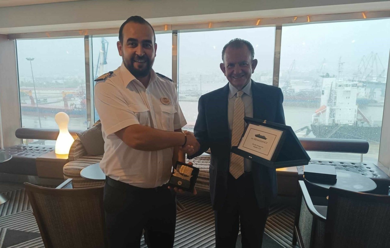Ο Διευθύνων Σύμβουλος του Οργανισμού Λιμένος Βόλου Σωκράτης Αναγνώστου, συζήτησε με τον καπετάνιο για θέματα κρουαζιέρας και οι δύο άντρες αντάλλαξαν αναμνηστικές πλακέτες.