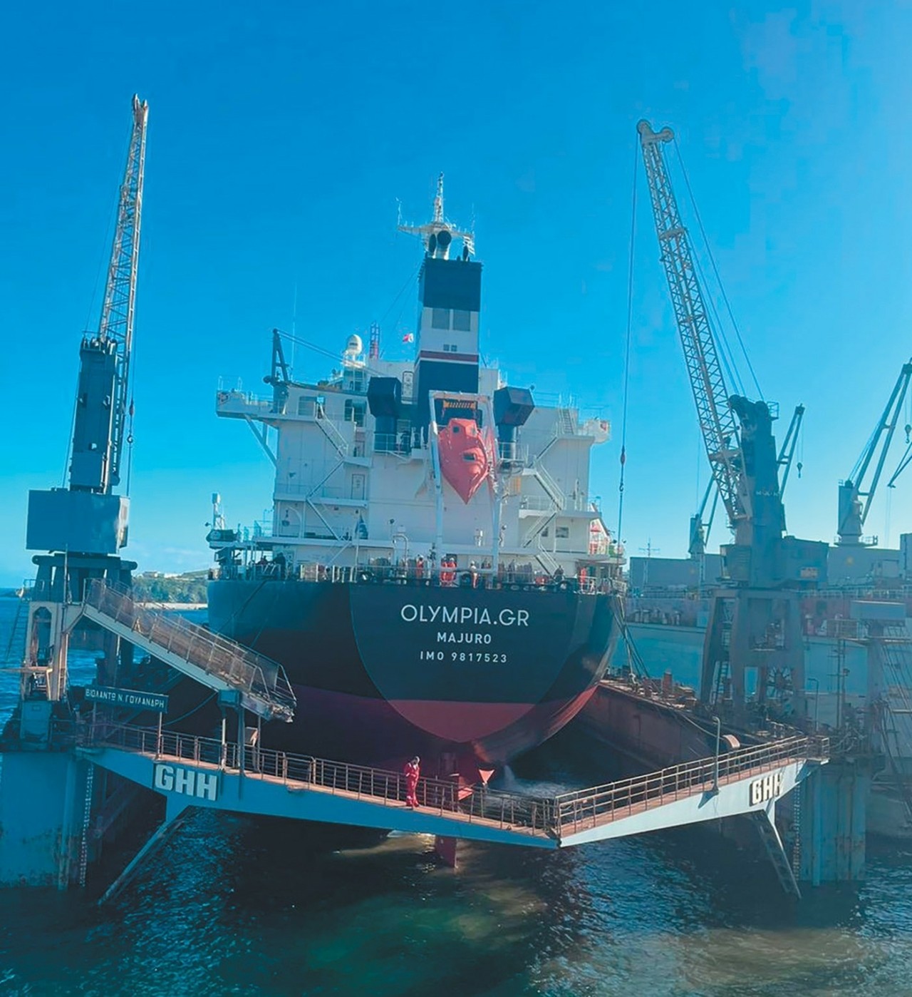 Σκοπός μου ήταν να δω από κοντά πώς γίνεται ο δεξαμενισμός ενός πλοίου σε ελληνικό ναυπηγείο. Αποδείχτηκε μια ξεχωριστή βιωματική εμπειρία. Συναντηθήκαμε στην είσοδο του ναυπηγείου με την κυρία Ελίζα Γερούκη, υπεύθυνη Εταιρικής Επικοινωνίας της Μ/ΜΑRITIΜΕ, ρόλος σπάνιος και δύσκολος στη ναυτιλία, η οποία είναι πάντα παρούσα στους δεξαμενισμούς των πλοίων της εταιρείας όταν γίνονται στην Ελλάδα. Πρώτη της κίνηση ήταν να μου δώσει το κράνος με το διακριτικό σήμα της εταιρείας, αφού «μπαίνουμε ουσιαστικά σε εργοτάξιο, στο οποίο είναι απαραίτητο για λόγους ασφαλείας» όπως μου είπε. Κατευθυνθήκαμε στην ανακαινισμένη Panamax-size δεξαμενή «ΒΙΟΛΑΝΤΩ Ν. ΓΟΥΛΑΝΔΡΗ».