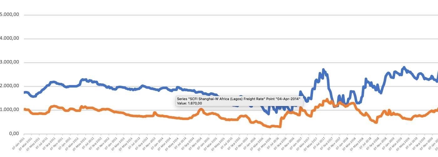 “ Το 3ο διάγραμμα μας δίνει τους ναύλους μεταφοράς Κίνα-Δ. & Αν. Αφρική την προηγούμενη δεκαετία και έως την πανδημία (2011-2019). Η Αφρική εισάγει τρόφιμα.