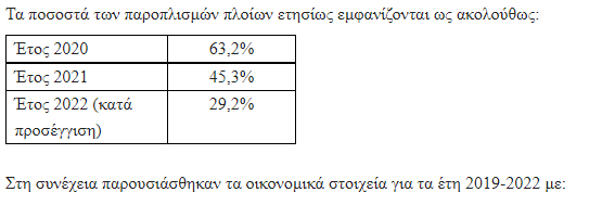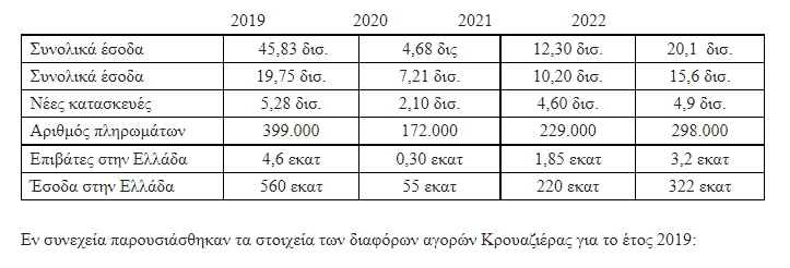 Τα έσοδα στην Ελλάδα από την κρουαζιέρα έφθασαν τα 322 εκατομμύρια ευρώ έναντι 560 εκατ. το 2019 55 εκατ το 2020 και 220 εκατ. το 2021. Ήτοι μειωμένα κατά 42,5% έναντι του 2019 αλλά αυξημένα κατά 46,3% σε σχέση με το 2021.