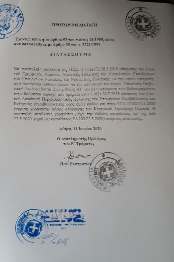Την προσωρινή αναστολή εκτέλεσης έργων για την κατασκευή-επέκταση του προβλήτα κρουαζιέρας στο λιμάνι του Πειραιά αποφάσισε το Ε’ Τμήμα του Συμβουλίου της Επικρατείας.