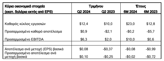 Για το πρώτο εξάμηνο του 2024, η Εταιρεία πραγματοποίησε καθαρά έσοδα ύψους 23,0 εκατ. δολαρίων σε σύγκριση με τα 12,8 εκατ. δολάρια την ίδια περίοδο του 2023. Οι καθαρές ζημιές και οι προσαρμοσμένες καθαρές ζημιές για το πρώτο εξάμηνο του 2024 ήταν 0,7 εκατ. δολάρια και 0,2 εκατ. δολάρια αντίστοιχα, σε σύγκριση με τις καθαρές ζημίες ύψους 7,9 εκατ. δολαρίων και τις προσαρμοσμένες καθαρές ζημιές ύψους 5,7 εκατ. δολαρίων την αντίστοιχη περίοδο του 2023. Το προσαρμοσμένο EBITDA για το πρώτο εξάμηνο του 2024 ανήλθε σε 10,0 εκατ. δολάρια σε σύγκριση με τα 0,6 εκατ. δολάρια την αντίστοιχη περίοδο του 2023. Το TCE του στόλου για το πρώτο εξάμηνο του 2024 ήταν 16.187 δολάρια ανά ημέρα.